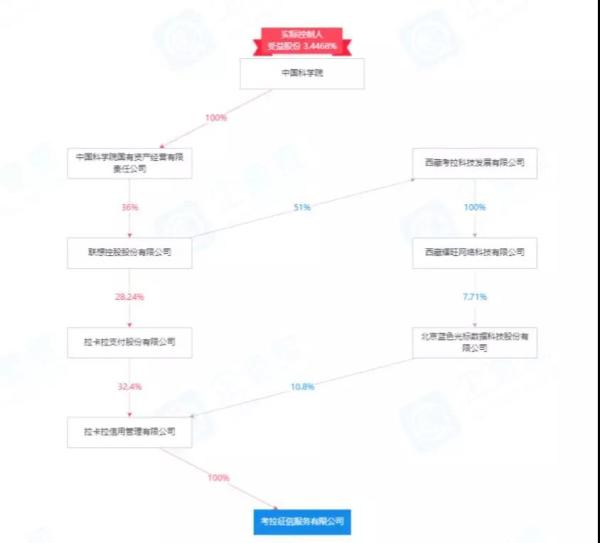 考拉征信服务有限公司曾用名拉卡拉(北京)征信服务有限公司,成立于 2014 年 4 月,注册资本 5000 万元,法定代表人为邹铁山,唯一股东为拉卡拉信用管理有限公司,穿透后,其实际运营方为拉卡拉支付,实际控制人为联想控股。