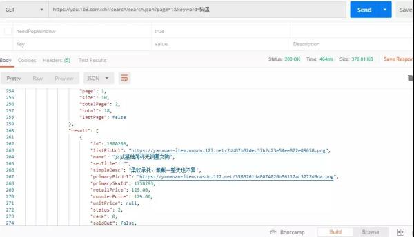 搜索一般都是 search,所以我们就锁定了这个 search.json 的请求。同样把请求 URL 拷贝到 Postman 中,逐个验证传参,最后保留 page 和 keyword 两个参数即可。