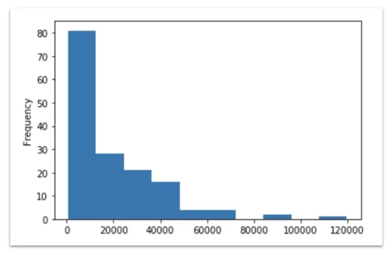 np.exp(data[data['Year']==2018]['LogGDP per capita']).plot( kind='hist' ) 运行上述命令,生成以下图表。