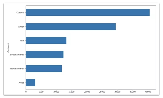 np.exp(data[ data['Year'] == 2018 ].groupby('Continent')['Log GDP per capita']\ .mean()).sort_values().plot( kind='barh', figsize=(12,8) )澳大利亚和新西兰2011年人均GDP(美元)明显领先