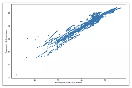 该散点图显示了《世界幸福报告》的预期寿命与Gapminder的预期寿命两者之间的高度相关性
