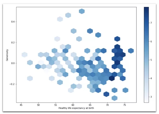 2018年:Hexbin图,表示人的平均寿命与慷慨程度之间的关系。格子的颜色表示每个格子的平均寿命。