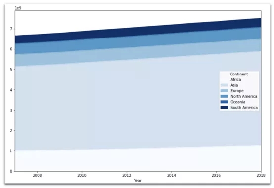 data.groupby( ['Year','Continent'] )['Gapminder Population'].sum().unstack().plot( kind='area', figsize=(12,8), cmap="Blues", # defaults toorangish )