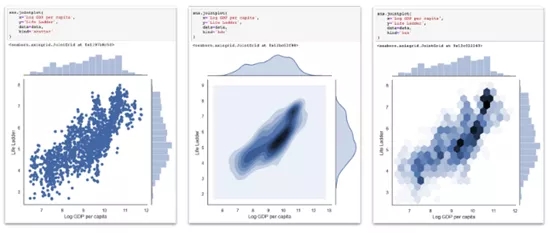 每当我想要直观地探索两个或多个变量之间的关系,总是用到某种形式的散点图和分布评估。在概念上相似的图表有三种变体。在每个图中,中心图(散点图,二元KDE,hexbin)有助于理解两个变量之间的联合频率分布。此外,在中心图的右边界和上边界,描述了各自变量的边际单变量分布(用KDE或直方图表示)。