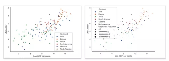 人均GDP与生活阶梯的关系,不同颜色表示不同大洲和人口规模