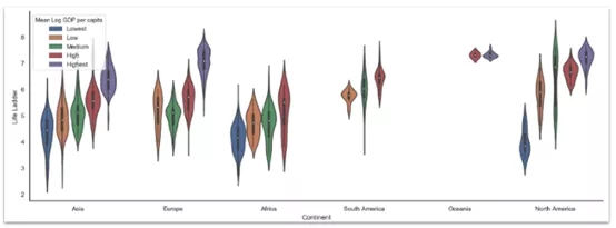 sns.set( rc={'figure.figsize':(18,6)}, style="white")sns.violinplot( x='Continent', y='Life Ladder', hue='Mean Log GDP per capita', datadata=data)sns.despine()小提琴图在绘制大洲与生活阶梯的关系图时,用人均GDP的平均值对数据进行分组。人均GDP越高,幸福指数就越高。