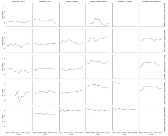 y轴代表生活阶梯,x轴代表年份。网格的列代表大洲,网格的行代表不同水平的人均GDP。总体而言,北美人均GDP平均值较低的国家和欧洲人均GDP平均值中等或较高的国家,情况似乎有所好转。