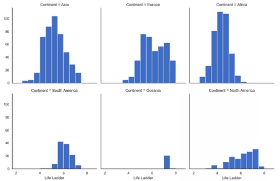 对我来说,Seaborn的FacetGrid是证明它好用最有说服力的证据之一,因为它能轻而易举地创建多图表。通过配对图,我们已经看到了FacetGrid的一个示例。它可以创建多个按变量分组的图表。例如,行可以是一个变量(人均GDP的类别),列是另一个变量(大洲)。