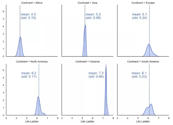 defvertical_mean_line(x, **kwargs): plt.axvline(x.mean(), linestyle="--", color= kwargs.get("color", "r")) txkw =dict(size=15, color= kwargs.get("color", "r")) label_x_pos_adjustment =0.08# this needs customization based on your data label_y_pos_adjustment =5# this needs customization based on your data if x.mean() <6: # this needs customization based on your data tx ="mean: {:.2f}\n(std: {:.2f})".format(x.mean(),x.std()) plt.text(x.mean() + label_x_pos_adjustment, label_y_pos_adjustment, tx, **txkw) else: tx ="mean: {:.2f}\n (std: {:.2f})".format(x.mean(),x.std()) plt.text(x.mean() -1.4, label_y_pos_adjustment, tx, **txkw) _ = data.groupby(['Continent','Year'])['Life Ladder'].mean().reset_index() g = sns.FacetGrid(_, col="Continent", height=4, aspect=0.9, col_wrap=3, margin_titles=True) g.map(sns.kdeplot, "Life Ladder", shade=True, color='royalblue') g.map(vertical_mean_line, "Life Ladder")annotate_facet_grid.py hostedwith ❤ by GitHub