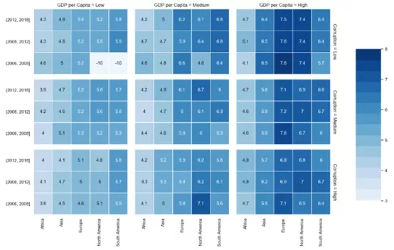 Facet热图,外层的行显示在一年内,外层的列显示人均GDP,内层的行显示政治清廉,内层的列显示大洲。我们看到幸福指数朝着右上方向增加(即,高人均GDP和高政治清廉)。时间的影响还不确定,一些大洲(欧洲和北美)似乎比其他大洲(非洲)更幸福。