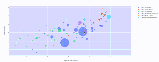 fig = x.<PLOTTYPE>(PARAMS)然后是 fig.show() ,像这样: fig = px.scatter( datadata_frame=data[data['Year'] ==2018], x="Log GDP per capita", y="Life Ladder", size="GapminderPopulation", color="Continent", hover_name="Country name", size_max=60 ) fig.show()