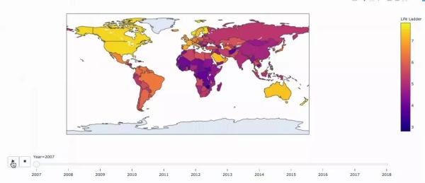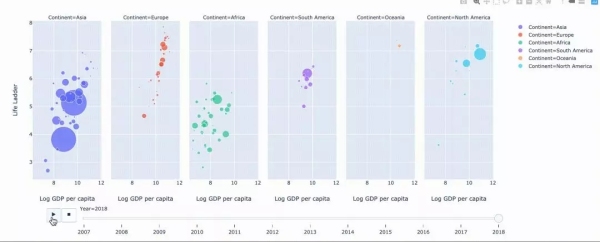 fig = px.scatter( datadata=data, x="Log GDP per capita", y="Life Ladder", animation_frame="Year", animation_group="Countryname", size="GapminderPopulation", color="Continent", hover_name="Country name", facet_col="Continent", size_max=45, category_orders={'Year':list(range(2007,2019))} )fig.show()可视化数年来绘图数据的变化