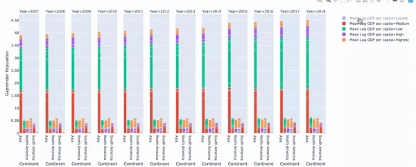 fig = px.bar( data, x="Continent", y="Gapminder Population", color="Mean Log GDP percapita", barmode="stack", facet_col="Year", category_orders={"Year":range(2007,2019)}, hover_name='Country name', hover_data=[ "Mean Log GDP percapita", "Gapminder Population", "Life Ladder" ] ) fig.show()过滤条形图很容易。毫无疑问,韩国是亚洲富裕国家之一。
