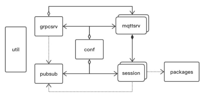从架构图中我们可以清晰地看到由7 个模块组成,分别是:conf 、grpcsrv 、mqttsrv、session、pubsub、packet、util ,每个模块的作用如下: