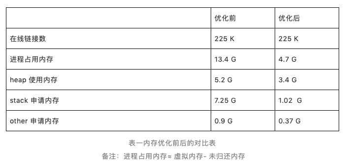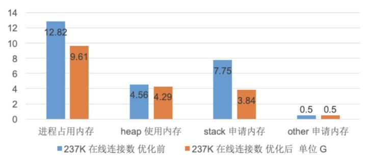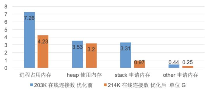 网络模型修改测试完成后开始灰度上线,通过监控数据对比如下表:在优化后比优化前的连接数多10 K的情况下,heap 使用内存降低 0.33 G,stack 申请内存降低 2.34 G,优化效果显著。