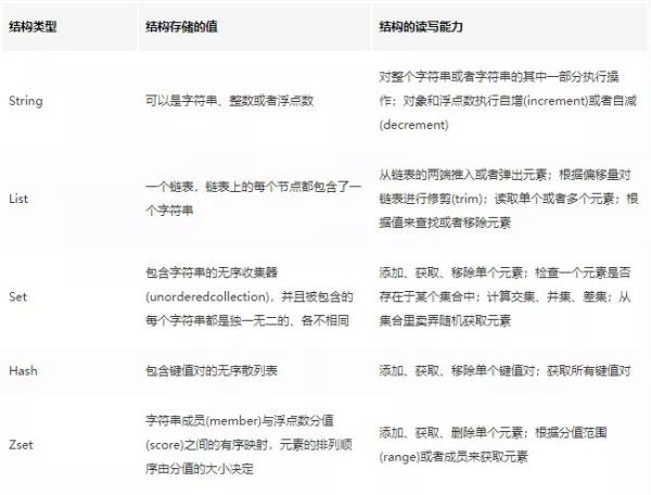 Redis 可以存储键与 5 种不同数据结构类型之间的映射,这5种数据结构类型分别为 String(字符串)、List(列表)、Set(集合)、Hash(散列)和 Zset(有序集合)。