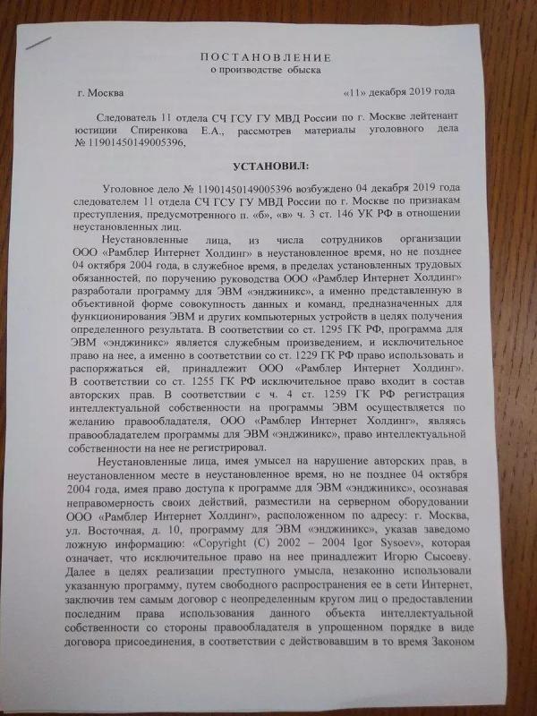 此案现已根据俄罗斯联邦《刑法》第 146 条第 3 款(侵犯版权和相关权)提起。