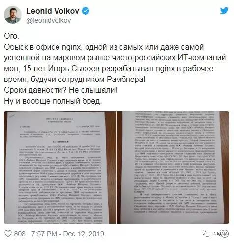 即便如此,还是有其他员工证实了此事。一位员工表示,在本次突击检查中,有两名 NGINX 员工被拘留,其中包括联合创始人兼现任首席技术官 Igor Sysoev,以及联合创始人 Maxim Konovalov 。