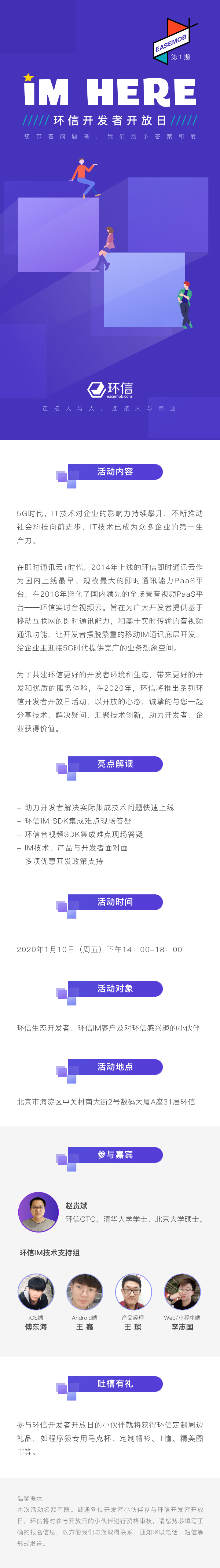 2020年,为了共建更好的开发者环境和生态,带来更优质的开发服务体验,环信将推出系列开发者开放日活动,以开放的心态,诚挚的与您一起分享技术、畅聊趋势、解决疑问,汇聚技术创新,助力开发者、重塑IT价值。