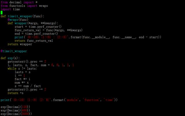 @timeit_wrapper def exp(x): ... print('{0:<10} {1:<8} {2:^8}'.format('module', 'function', 'time')) exp(Decimal(150)) exp(Decimal(400)) exp(Decimal(3000))