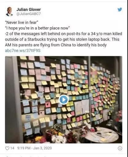 2019 年 12 月 31 日,美国加州奥克兰市的一家星巴克内,34 岁的中国工程师曾硕遭遇一场突如其来的抢劫,贼人抢走其笔记本电脑,曾在追上贼人逃跑车过程中遭车拖行数十米,摔落后不幸身亡。
