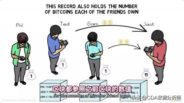 现在看到之前的例子,假设让Phil、Ted和Sam每人给Jack两个比特币,作为昨晚的饭钱。假设Phil、Ted和Sam有三个比特币,而Jack有5个。首先,Phil给Jack两个比特币,区块形式的记录被创建,他们之间的交易细节被永久地记录在这个区块中,当中还记录了每个人拥有的比特币数量。因此在Phil交易后,Jack有了七个比特币,而Phil有一个。