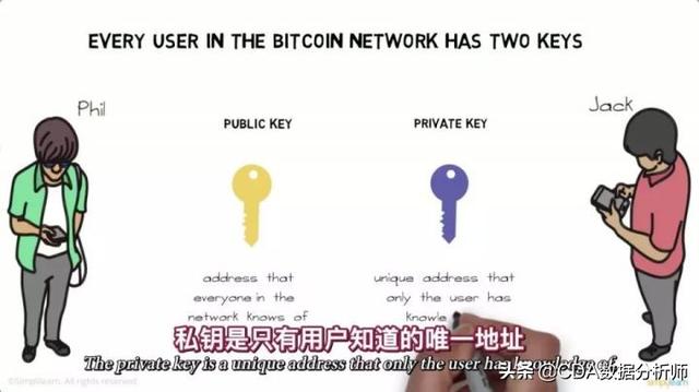 比特币网络中的每个用户都有两副钥匙,分别为公钥和私钥。公钥是网络中每个人都知道的地址,类似用户的电子邮箱地址。私钥是只有用户知道的唯一地址,类似密码。