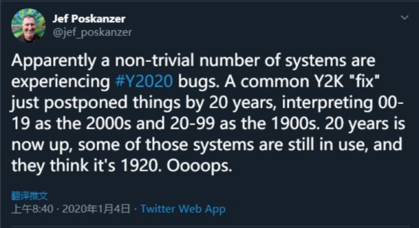 程序员 Jef Poskanzer 在推特上发文:似乎有相当数量的系统出现 #2020 错误。当年解决 Y2K 问题的方案把这个问题推迟了 20 年……20 年后的今天,当时的一些系统仍然还在使用,系统以为我们在 1920 年。”