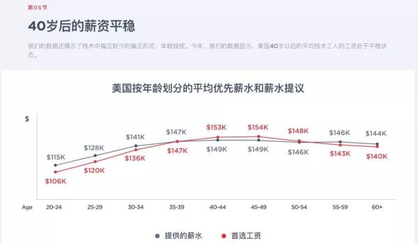 可以看出国外平均薪资最高是在 40-50 岁区间内,这个阶段的薪资最高,但是可以预见的是这个年龄区间的应该是管理层。同时该阶段的薪资水平也基本陷入了停滞的状态,意味着不会有更多的提升。