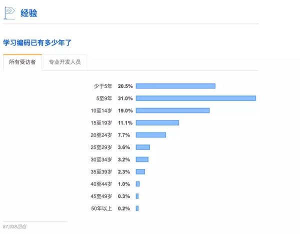 受访者的开发经验分布图就显得很奇异,在中国估计不大多见: