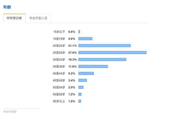 可以看到开发经验在 5-9 年的占比 31%,国外也是 30 岁以下的程序员占比最大,而 10-14 年的也占比 19%。