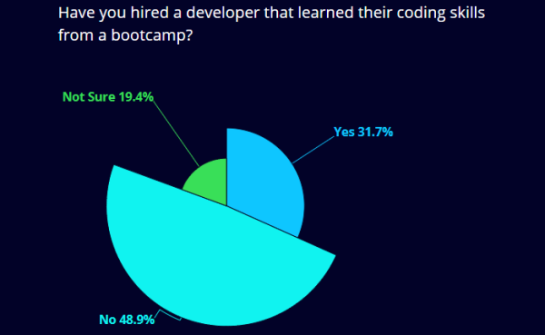 在被问及“是否聘请过从编程训练营获取编程技能的开发者”时,有 31.7% 的招聘主管(注意不是 HR,而是指有人才需求的用人部门主管)曾聘请过培训班出身的开发者,将近一半(48.9%)的招聘主管则给出了否定的回答。