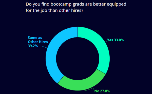 • 三分之一的招聘主管聘请过从编程训练营(类似于线上编程培训班)毕业的开发者