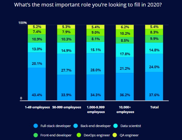 • 38% 的招聘主管对全栈开发者的需求最大,其次是后端开发者和数据科学家