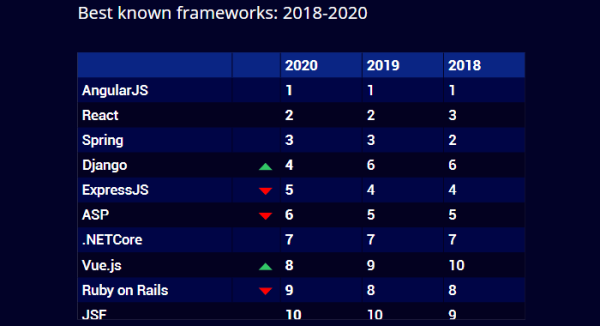 • AngularJS 是最知名的框架,其次分别是 React 和 Spring