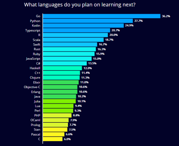 连续三年,Go 都是开发者最想学习的编程语言,其次是 Python 和 Kotlin。自 2009 年诞生以来,由 Google 创建的 Go 就受到越来越多开发者的欢迎,部分原因当然是其背后创建者的大力推动,但也离不开它自身的优秀。