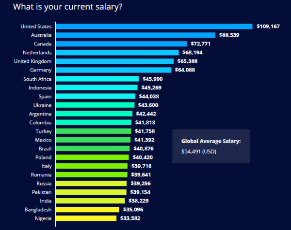 观察各国开发者的收入,可以看到美国开发者的薪资最高,平均年薪为 10.9 万美元,整整是全球平均年薪的两倍。澳大利亚和加拿大是开发者第二高薪的国家,平均年薪分别为 8.8 万美元和 7.3 万美元。