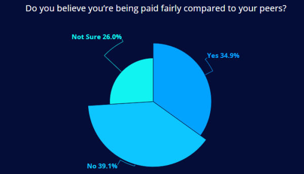 根据 HackerRank 的调查,只有 35% 的开发者认为他们获得了合理的报酬。另一方面,39% 的开发者认为与和自己经验相仿的同行对比,他们获得对应的报酬不合理,还有 26% 的开发者对此不确定。