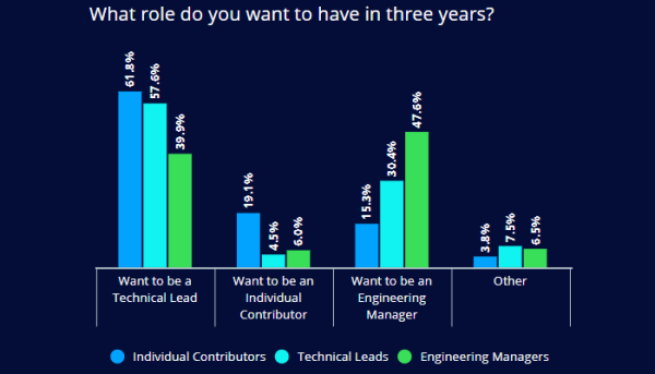 • 61.8% 的开发者希望在三年内成为技术 leader,而不是管理者