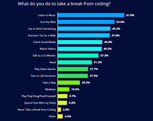 当开发者不写代码时,他们大多数会把时间花在听音乐(61%)上。网上冲浪(52%)、美食(48%)和运动(48%)也是打发时间的热门选择。但是 3% 的开发者表示,他们从不休息(极有可能是来自国内的开发者)!
