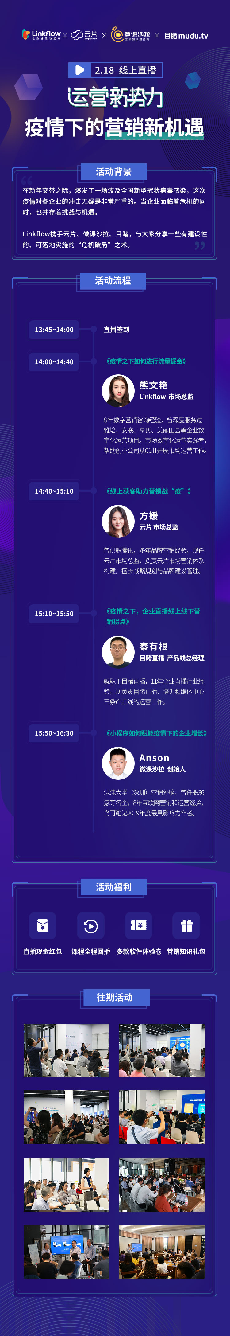 为此,Linkflow携手云片、微课沙拉、目睹,环信,与大家分享疫情下一些有建设性的、可落地实施的“危机破局”之术。
