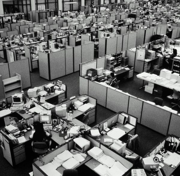 1968 年,设计师 Robert Propst 在「办公室景观」的基础上进行改良,设计出了小隔间。那是一套组装办公桌以及能从桌面上展开的隔断。「Propst 本想要给办公室带来民主的气息,却开创了一套办公室格局和一项价值上十亿美元的产业,并且让奴役有了更具体的形态。」《纽约时报》作者 Pagan Kennedy 写道。