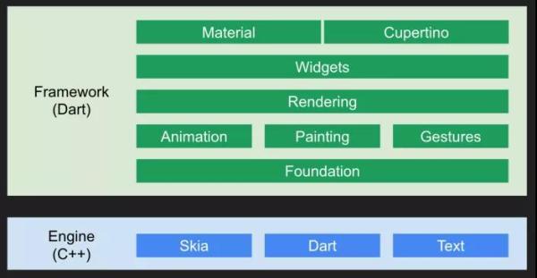 Framework: 开发框架。为开发者提供可编程 API,实现响应式的开发模式,提供细粒度 Widget 供开发者自由封装和组合。