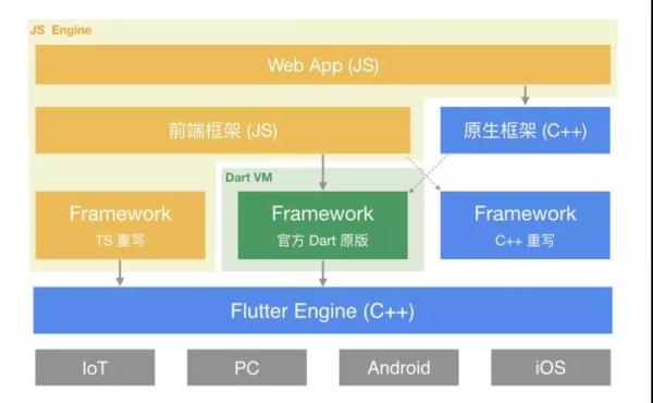 想要干掉 Dart VM,就需要用其他语言重新实现用 Dart 开发的 Framework,用 JS/TS 可以,用 C++ 当然可以,最硬核的方式就是用 C++ 重新实现 Flutter 的 Framework,然后接入 JS 引擎,通过 binding 把 C++ 接口透出到 JS 环境,上层应用还是用 JS 做开发。