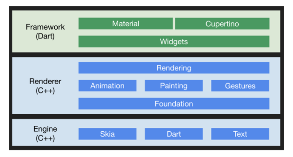 Renderer: 渲染引擎。专门实现布局、绘制、动画、手势的的处理,这部分功能相对独立,是可以与开发框架解耦的,也不必与特定语言绑定。