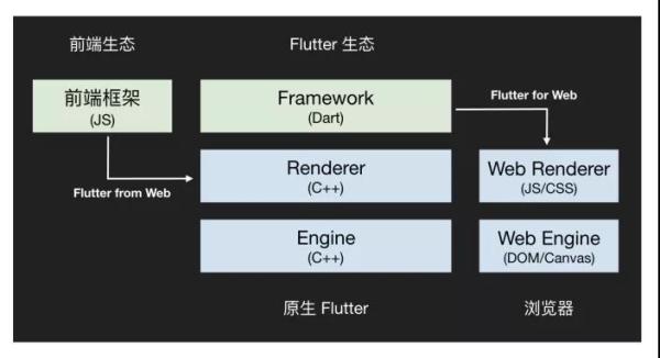 从 Web 到 Flutter。就是使用 Web 技术栈来开发,然后对接到 Flutter 上实现跨平台渲染。对 Web 来说是解决性能和跨平台一致性问题,对 Flutter 来说是解决生态复用问题。