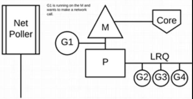 下图展示它的工作原理:G1 正在 M 上执行,还有 3 个 Goroutine 在 LRQ 上等待执行。网络轮询器空闲着,什么都没干。