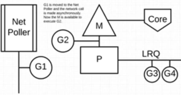 接下来,G1 想要进行网络系统调用,因此它被移动到网络轮询器并且处理异步网络系统调用。然后,M 可以从 LRQ 执行另外的 Goroutine。此时,G2 就被上下文切换到 M 上了。