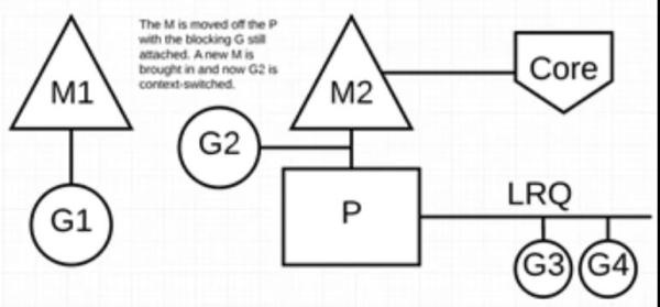 调度器介入后:识别出 G1 已导致 M1 阻塞,此时,调度器将 M1 与 P 分离,同时也将 G1 带走。然后调度器引入新的 M2 来服务 P。此时,可以从 LRQ 中选择 G2 并在 M2 上进行上下文切换。