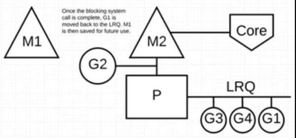阻塞的系统调用完成后:G1 可以移回 LRQ 并再次由 P 执行。如果这种情况再次发生,M1 将被放在旁边以备将来重复使用。